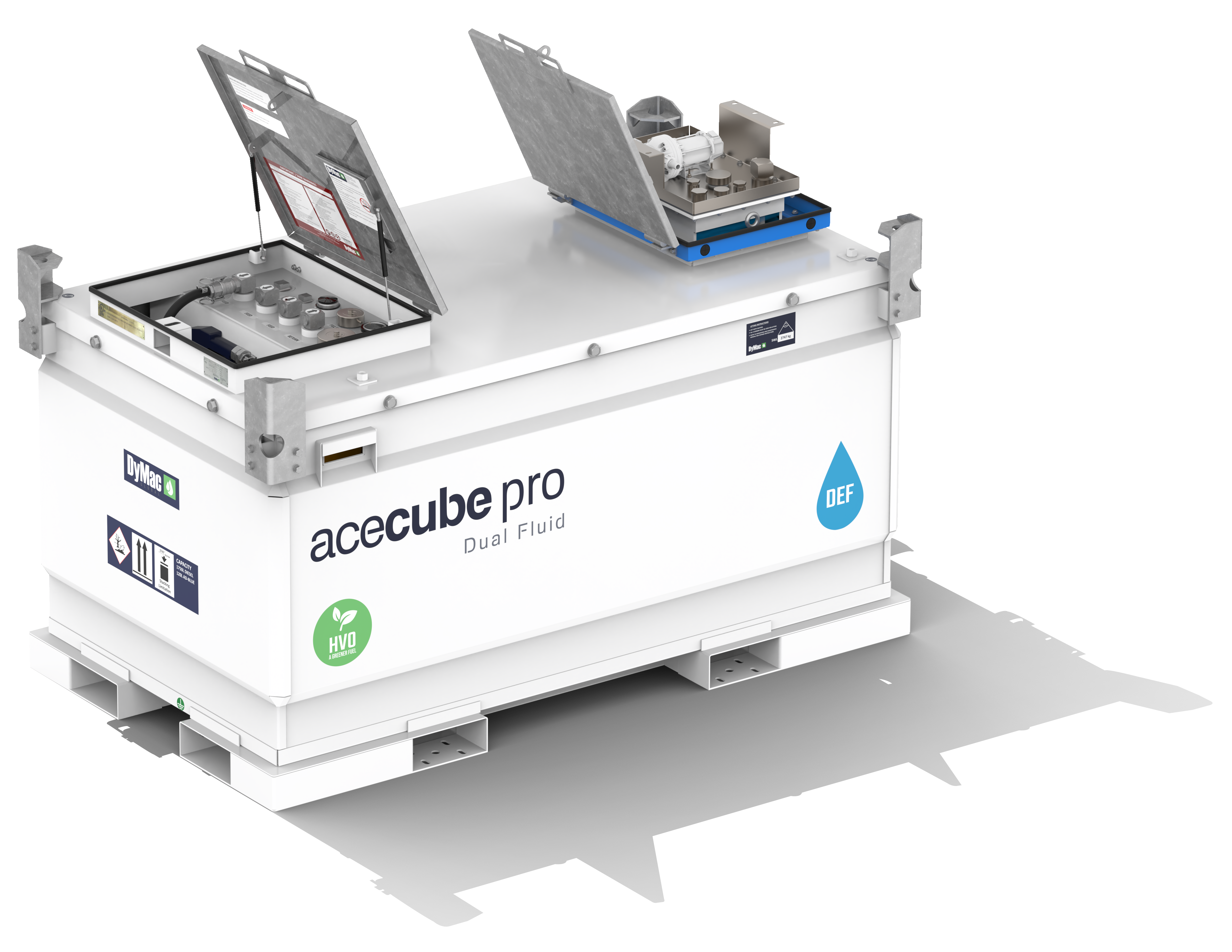 La gamma di serbatoi AceCube Pro Dual FLuid presenta un design con tasche per forche bidirezionali e piastre deflettenti interne per ridurre il movimento del liquido durante il trasporto. Gli angoli impilabili fungono anche da ganci di sollevamento, garantendo una maneggevolezza totale. Sotto il coperchio principale si trovano attacchi e raccordi posizionati strategicamente, che si aprono su un ampio vano per le attrezzature.