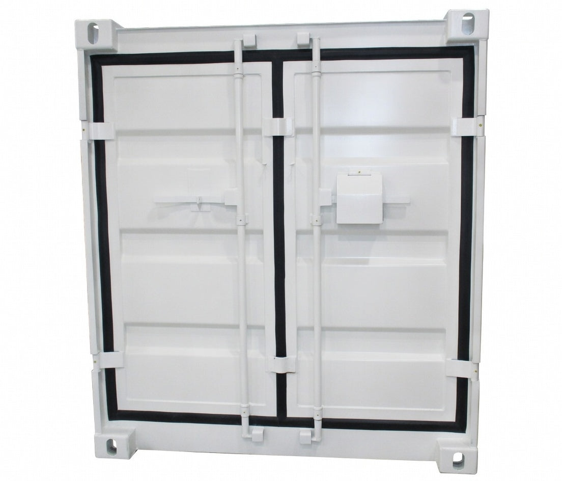 Porta del contenitore a 2 ante, realizzata in lamiera grecata in acciaio al carbonio con guarnizione perimetrale in gomma, con n° 2 barre di apertura, chiusura e bloccaggio verniciate .