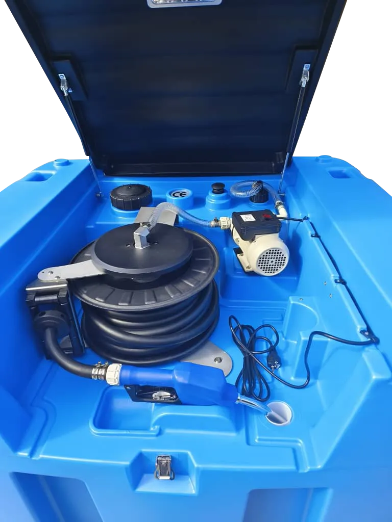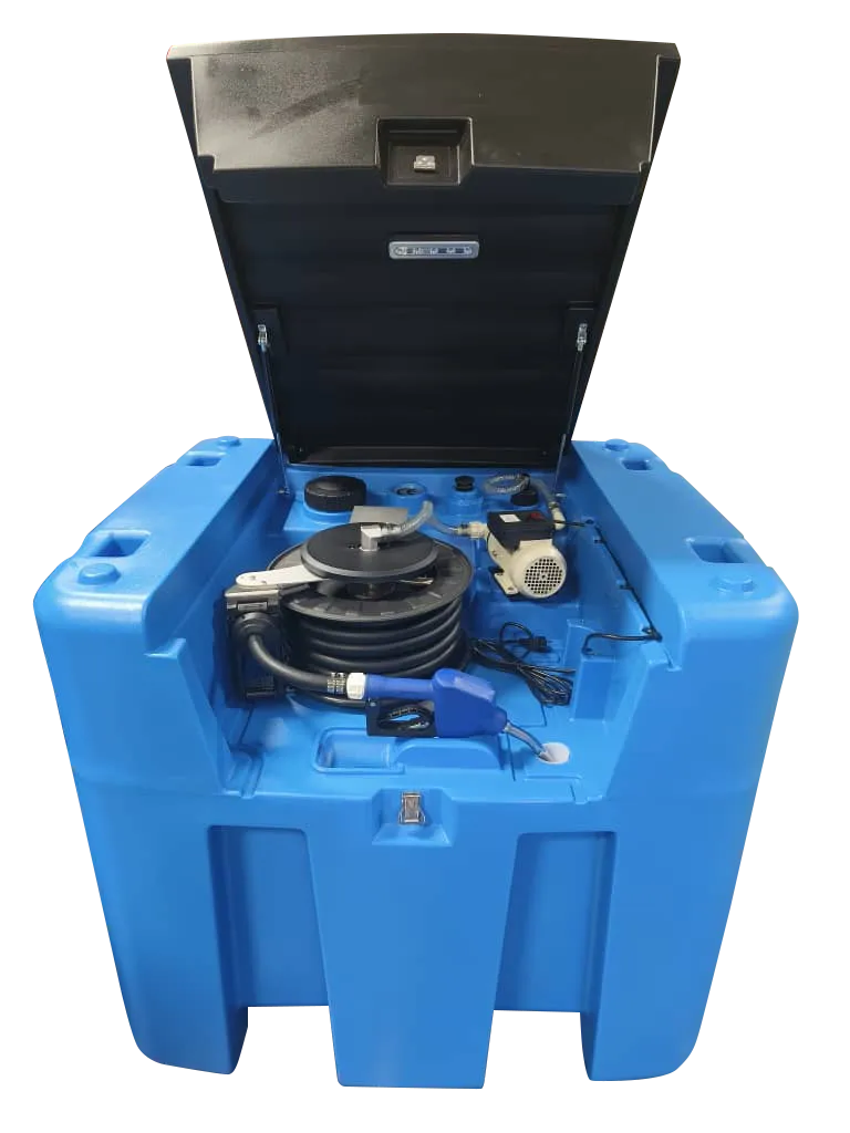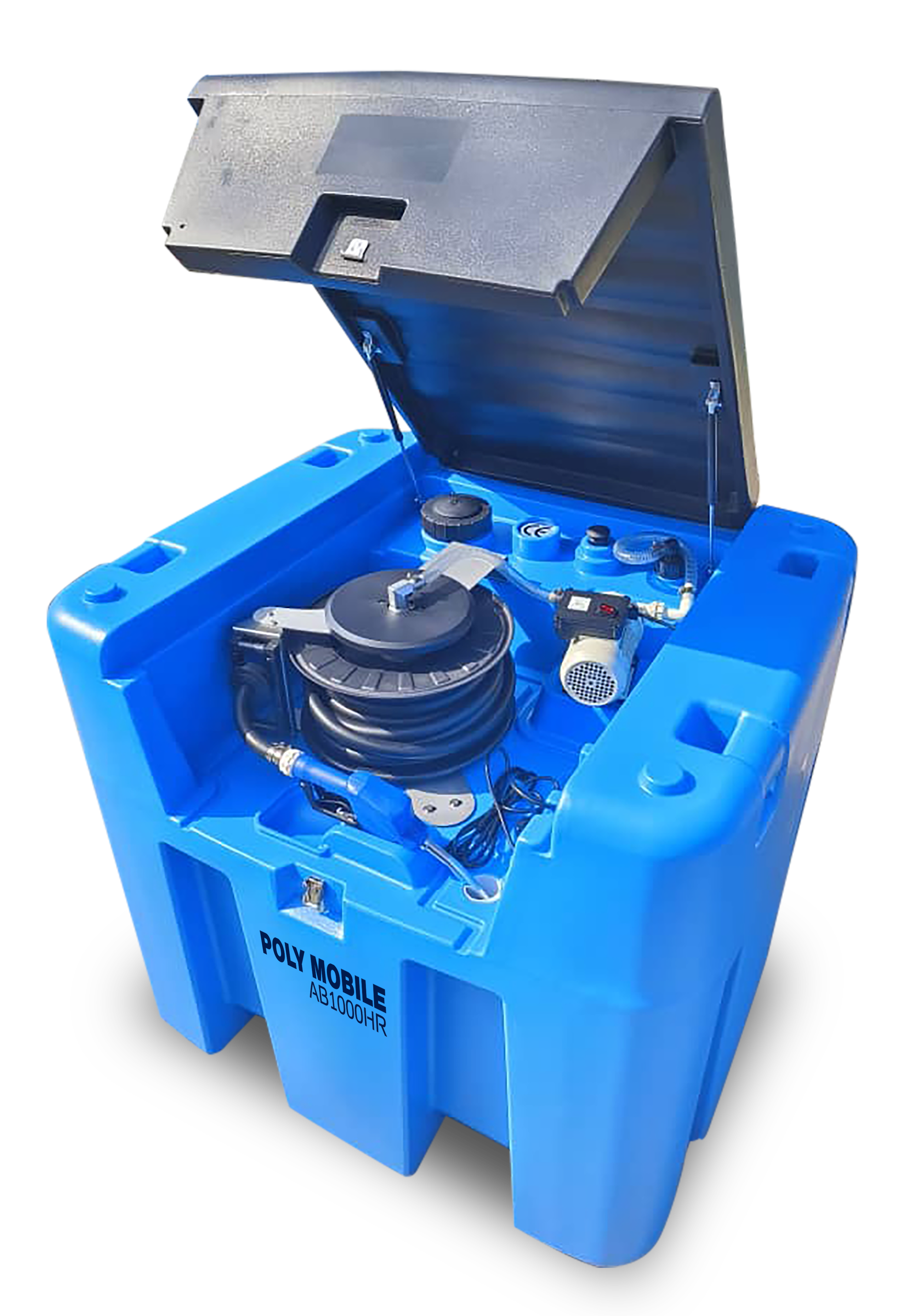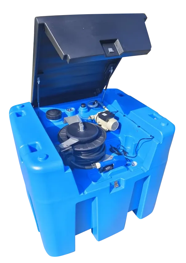 Il PMAB-1000HR è un serbatoio portatile per lo stoccaggio ed erogazione di AdBlue/DEF, con capacità di 1000 litri. Realizzato in polietilene ad alta densità (HDPE), è equipaggiato con: